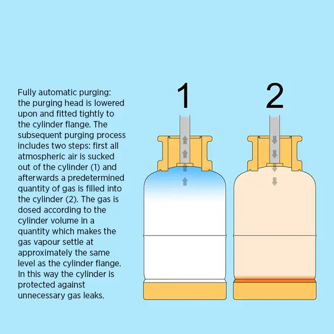 MAKEEN Energy's purging systems are designed for quick and safe replacement of atmospheric air in cylinders with LPG in vapour state. The process is applied on LPG cylinders without valves. Valves should be mounted right after the purging process.