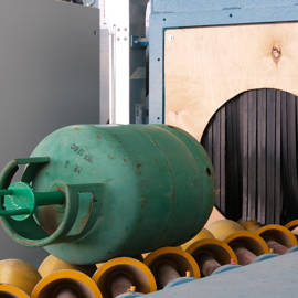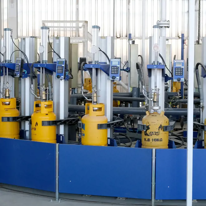 Consisting of two carrousel filling lines, one line for industrial cylinders, and a line for reconditioning, the filling and reconditioning plant is well-equipped to handle large quantities of cylinders each day. An automatic palletiser keeps the flow of cylinders high, and the cylinders pass through numerous automatic or semi-automatic machines to test for pressure or leaks, apply caps, and much more.