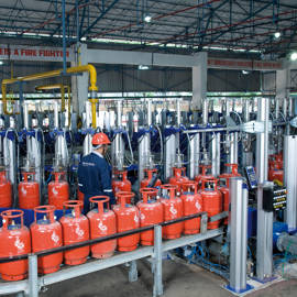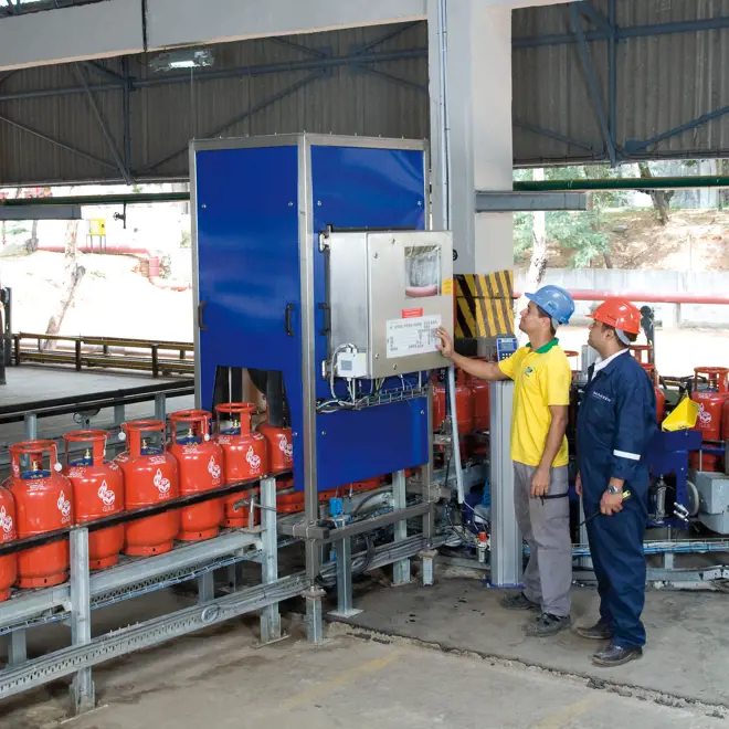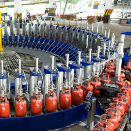 The need for cylinder maintenance was also reduced. As the operation is non-stop, all procedures are performed while the cylinders are flowing smoothly along the conveyor line without knocking into each other, which reduces the amount of damages to the cylinder surface. Utilities are reduced as well – compressed air and electricity, e.g. – and the weighing precision is second to none, ensuring that the LPG is used to the fullest extent.