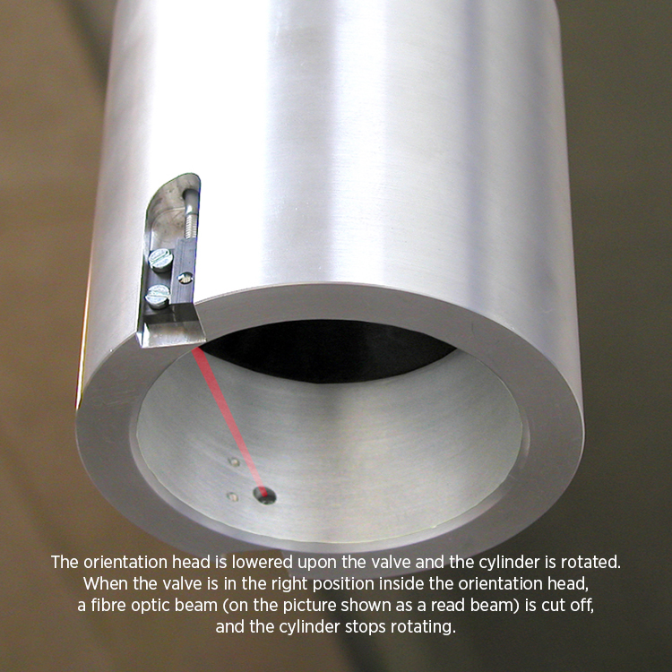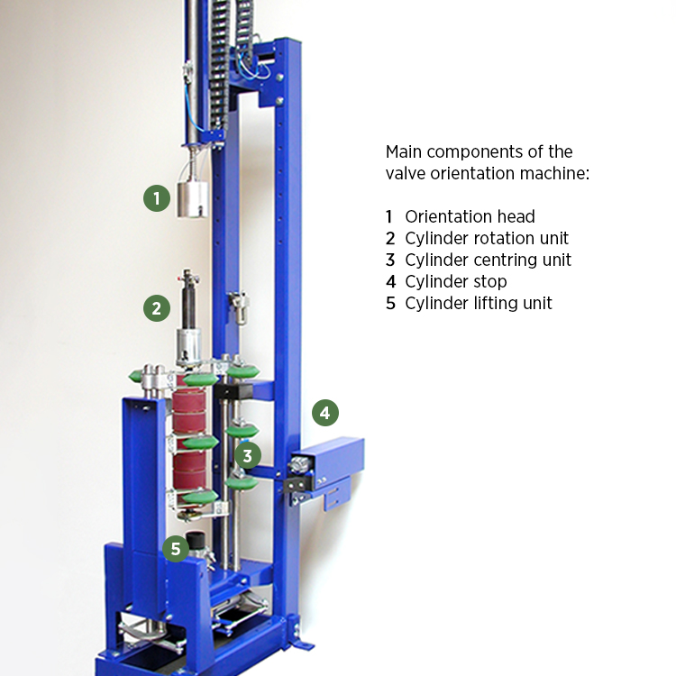 In connection with fully automatic filling on carrousel, the machine is placed before the introduction unit in order to ensure correct orientation of the cylinder valve before introduction of the cylinder onto the filling machine.