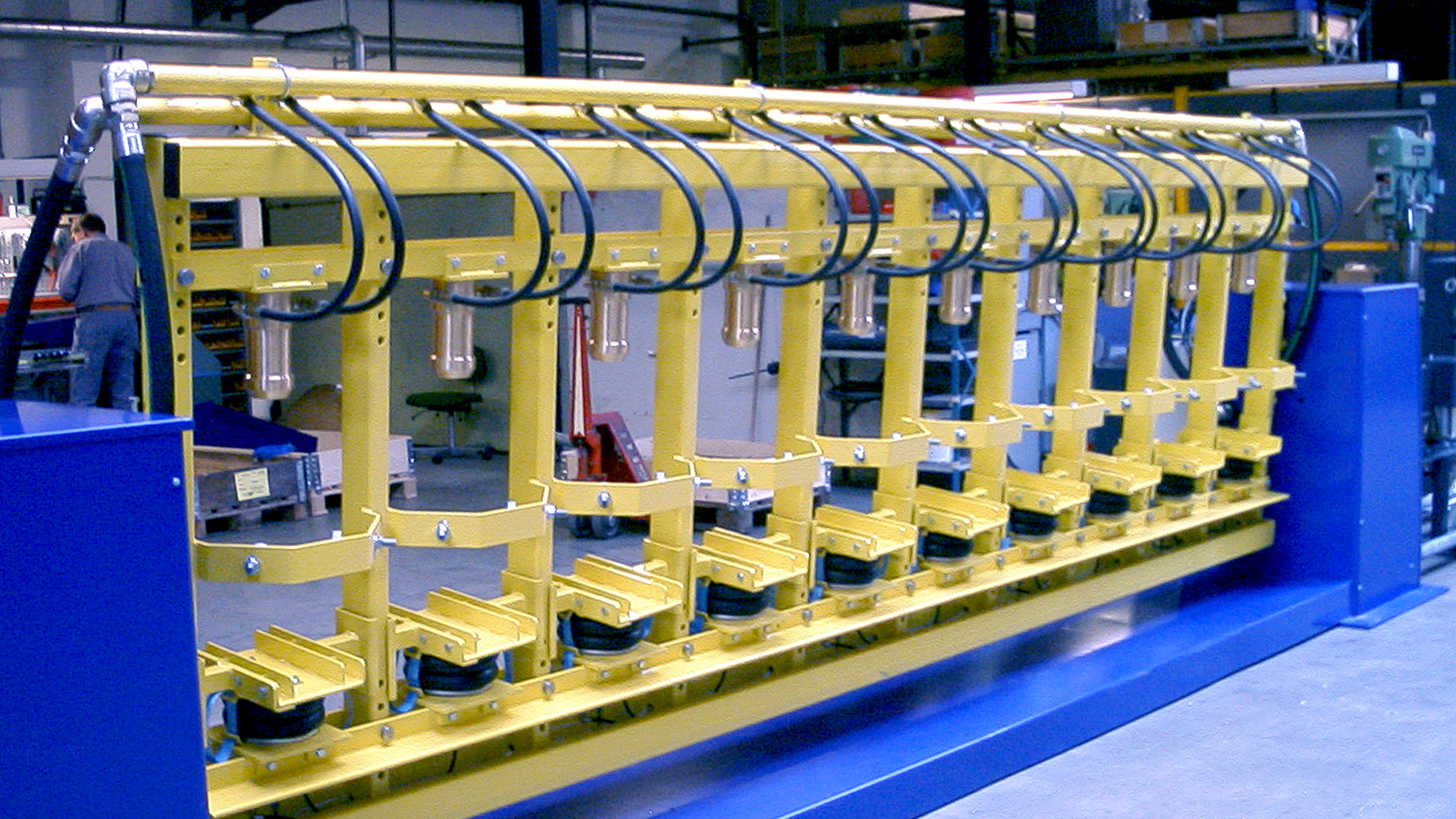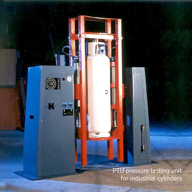 - Stand-alone pressure testing rack for one cylinder size, manually height adjustable, for industrial cylinders and domestic cylinders