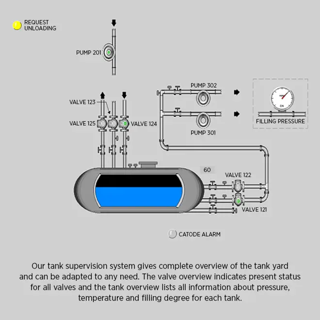 - Complete equipment for tank yards including safety equipment, measuring and control equipment as well as operating equipment and shut-off valves