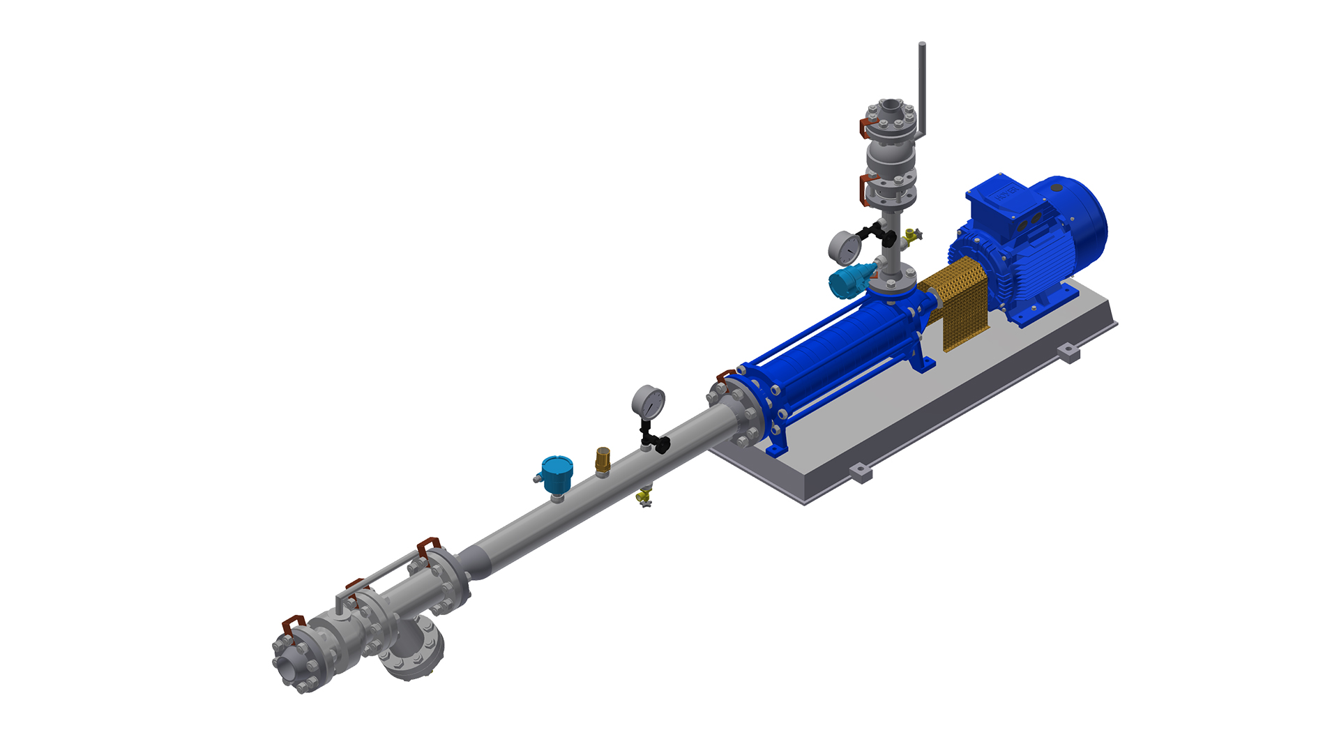 Typically, these pumps are delivered mounted on a painted steel base frame with an electric motor sized according to the required working parameters (differential pressure and flow) of the pump.